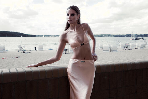Inspirée par l’esthétique des années 1950, elle mêle les codes de la couture d’après-guerre à des vêtements plus fonctionnels comme le maillot de bain, symboles d’une nouvelle affirmation féminine : active, libre et indépendante. Les femmes ne sont plus seulement représentées comme objets décoratifs, mais comme des sujets assumés, puissants, sensuels. En écho au langage visuel d’Helmut Newton, cette série s’approprie ce basculement des rôles et le réinterprète avec une vision résolument contemporaine.